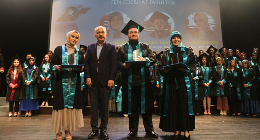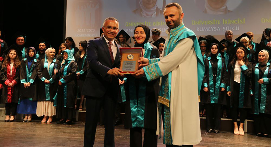 Mezun olan öğrencilerimize başarılarla dolu sağlıklı ve huzurlu bir meslek hayatı dileyerek tavsiyelerde bulunan Rektör Yılmaz, “Mezuniyet, yalnızca bir dönüm noktasıdır. Sizler bugünden itibaren toplumun beklentilerini karşılayacak olan bireylersiniz. Önünüzde uzun bir yol var ve bu yolda karşınıza çıkacak çeşitli zorluklar olacaktır. Hepiniz bunlarla başa çıkabilecek yeterliliğe sahip birer doktor, mühendis, öğretmen adayı olduğunuzu unutmayın. Hangi pozisyonda olursanız olun her zaman çok çalışarak, öğrenerek ve öğreterek yolunuza devam edin. Sizler bu milletin geleceği olarak topluma yön verecek ve toplumun değer yargılarını nesilden nesile taşıyacak olan gençlerimizsiniz. Sayın Cumhurbaşkanımızın da her fırsatta vurguladığı gibi, gençler olarak Türkiye Cumhuriyeti’nin nice yüz yıllarının mimarları sizler olacaksınız. Her şeyden önce, her birinizin özünde, tutku, kararlılık, inanç ve cesaret var. Unutmayın ki bu özellikler, başarılı olmanın anahtarlarını oluşturur. Yaptığınız işten, ilgi duyduğunuz alandan veya hayata dair sahip olduğunuz herhangi bir hedeften vazgeçmeyin. Sizler tıpkı üniversitemizin ismini taşıdığı, Cumhurbaşkanımız Sayın Recep Tayyip Erdoğan gibi çalışkan, kararlı ve erdemli olmalısınız.” dedi.