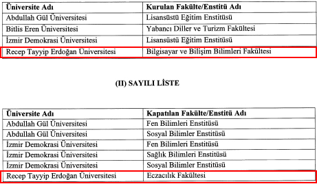 Bu düzenleme çerçevesinde Recep Tayyip Erdoğan Üniversitesi bünyesinde faaliyet gösteren Eczacılık Fakültesi kapatıldı. Aynı karar doğrultusunda üniversite bünyesinde Bilgisayar ve Bilişim Bilimleri Fakültesi kurulmasına karar verildi.