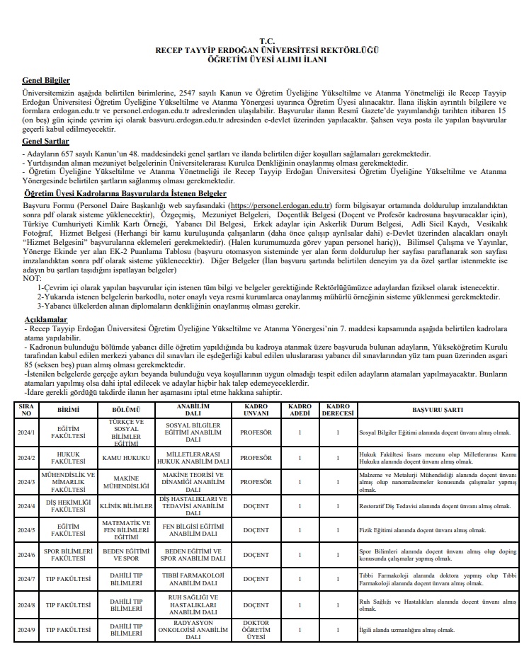 Recep Tayyip Erdoğan Üniversitesi (RTEÜ), 9 öğretim üyesi alımı yapacak.