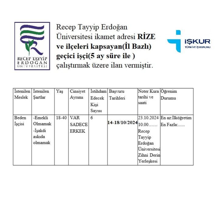 Rize İŞKUR'dan yapılan açıklamada, RTEÜ'nün ikamet adresi Rize ve ilçeleri kapsayan, 5 ay süre ile geçici beden işçisi çalıştırmak üzere ilan verdiği belirtildi.