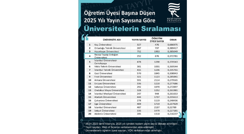 Konuya ilişkin sosyal medya hesabından açıklamalarda Rektör Yılmaz, bu yıl içinde öğretim üyesi başına düşen yayın sayısına göre, RTEÜ'nün 6 Nisan itibarıyla ülke genelindeki üniversiteler arasından 4. sırada yer almasının gururunu yaşadıklarını aktardı.