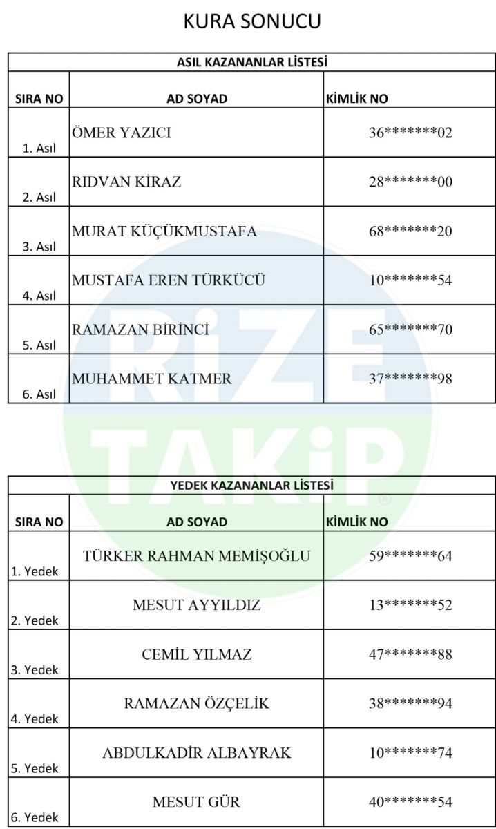 Açıklamada, kura sonucu kazanan asıl listedeki kişilerin 30 Ekim Çarşamba günü mesai bitimine kadar, RTEÜ İdari ve Mali İşler Daire Başkanlığı'na başvuru yapmaları gerektiği vurgulandı.