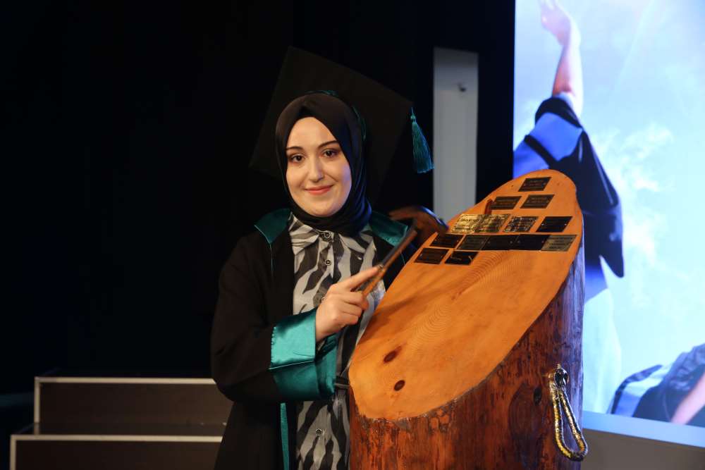 Törende, üniversitenin lisans düzeyinde 2023-2024 Akademik Yılı birincisi Eğitim Fakültesi İlköğretim Matematik Öğretmenliği Bölümü öğrencisi Semanur Özen, mezun öğrenciler adına konuşmasını yaparak, başarısının göstergesi olan mezuniyet kütüğüne ismini çaktı.