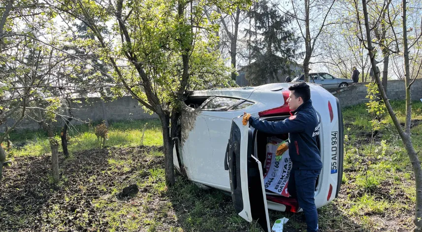 Köseli Mahallesi'nde sürücüsünün kimliği henüz belirlenemeyen 55 ALD 934 plakalı otomobil, kontrolden çıkarak önce bahçe duvarına çarptı, ardından tarlaya devrildi.
