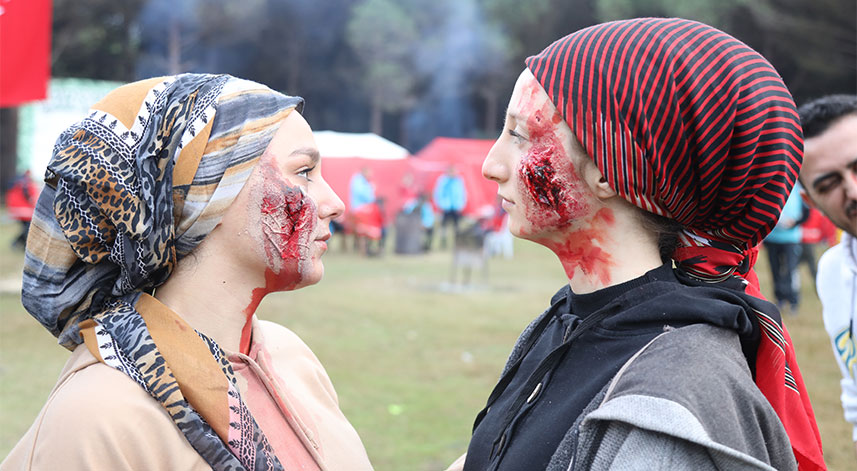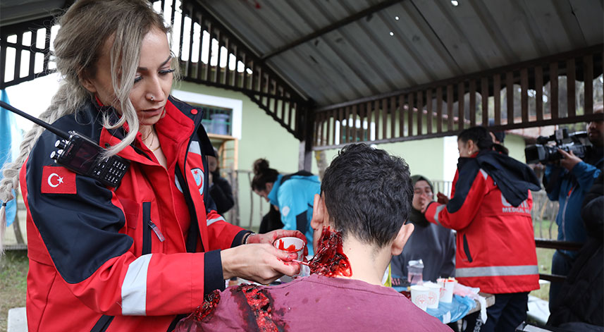 Tatbikat senaryosunda yaralıları canlandıran personel ise kostüm, makyaj ve oyunculukları ile gerçeği aratmadı.