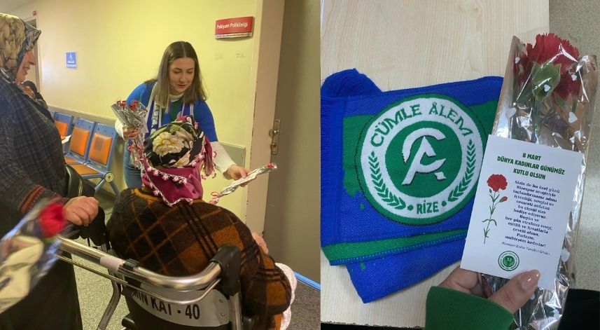 Rize Eğitim Araştırma Hastanesi’ni ziyaret eden Şehrin Melekleri kadın taraftar grubu üyeleri, hastane personeli ve hastalar arasında sevgi ve dayanışma duygularını pekiştirmek amacıyla kadınlara karanfil hediye ederek, anlamlı bir jest yaptı.