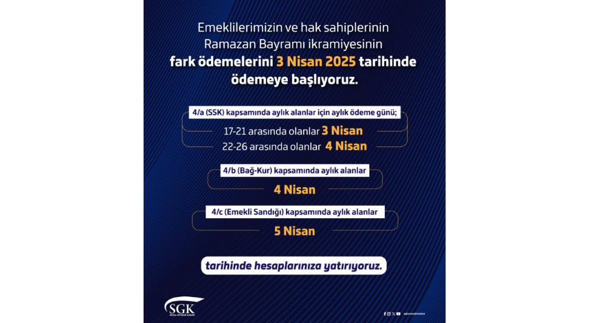 Sosyal Güvenlik Kurumu (SGK), bugün yaptığı açıklamayla"Emeklilerimizin ve hak sahiplerimizin Ramazan Bayramı ikramiyesinin fark ödemelerini 3 Nisan 2025 tarihinde ödemeye başlıyoruz." ifadelerini kullandı.