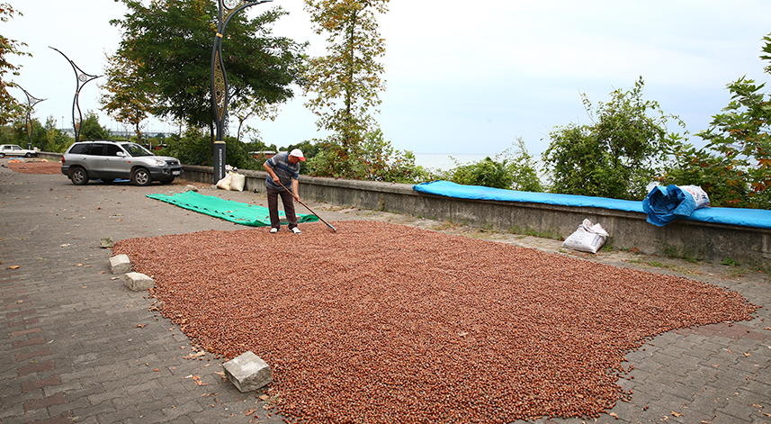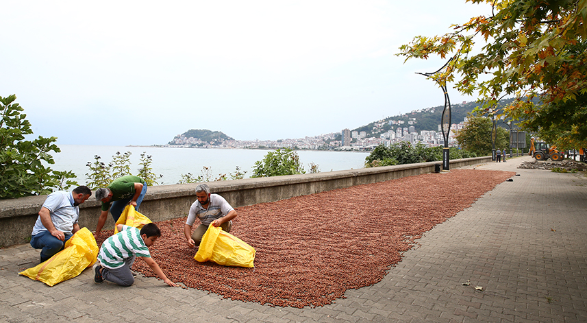 Giresun'da üreticiler, hasat ettikleri fındığı sahil kesimindeki yol kenarlarına sererek daha kısa zamanda kurutma imkanı buluyor.