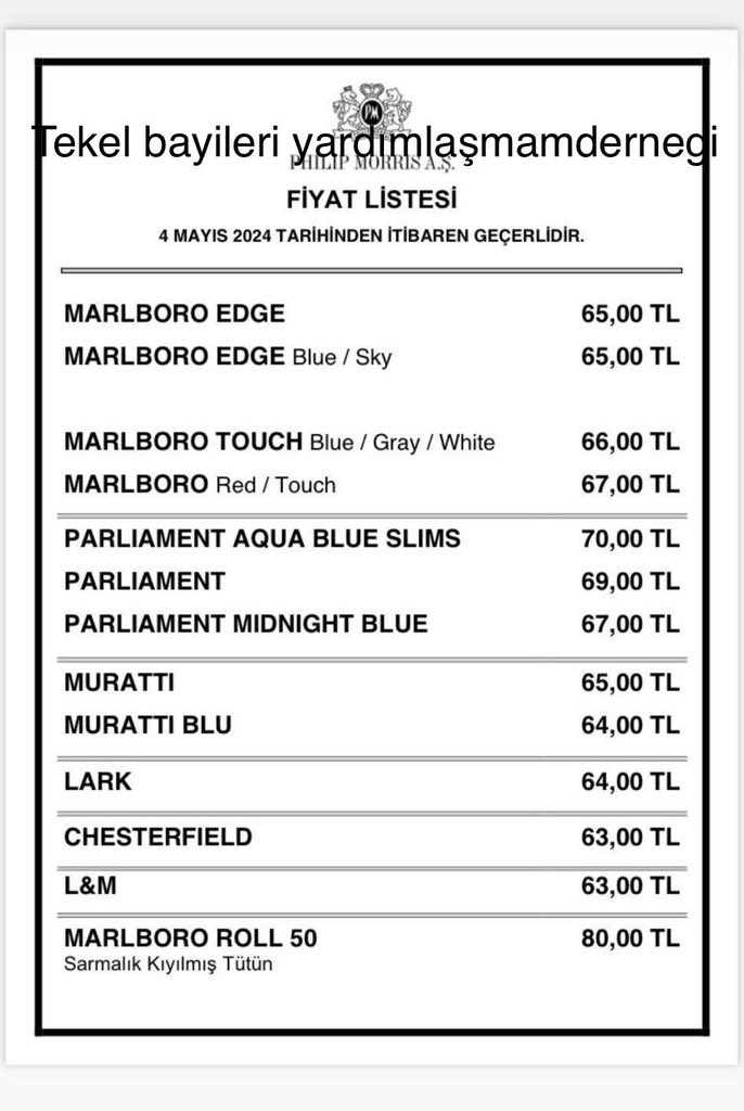 Nisan ayındaki zamla birlikte Philip Morris grubunun en pahalı sigarası 67 TL, en ucuzu ise 60 lira; BAT sigara grubunun en pahalı sigarası 72 TL, en ucuzu 56 lira; TT sigara grubunun en pahalı sigarası 62 TL, en ucuzu 50 lira olmuştu.