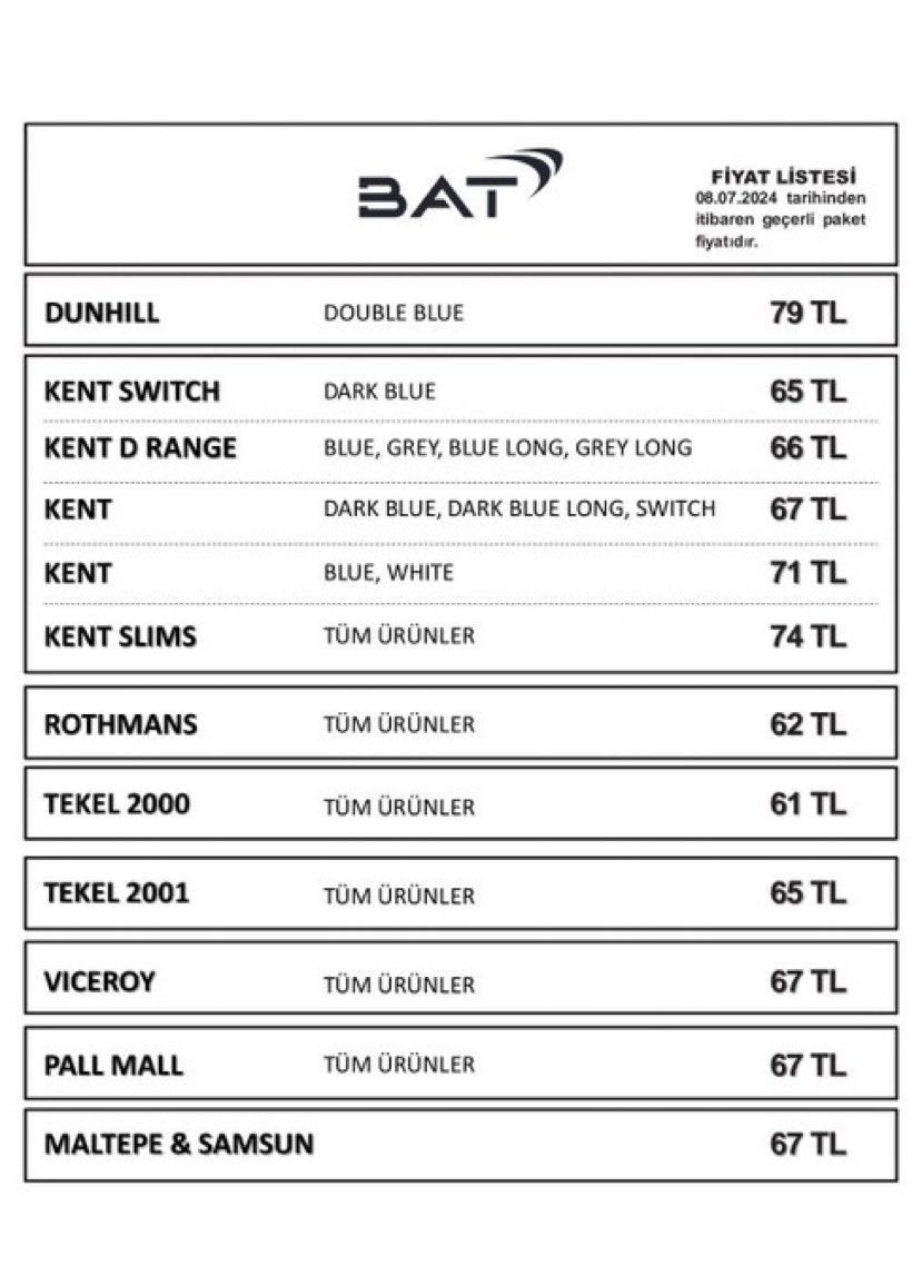 JTI sigara grubunun en pahalı sigarası 80 TL, en ucuz sigarası ise 71 TL oldu. PM sigara grubunun en pahalı sigarası 73 TL, en ucuzu 66 TL oldu. Imperial sigara grubu en pahalı sigarası 73 TL, en ucuzu 59 TL oldu. BAT grubunda ise en yüksek fiyat 79 TL olurken en düşük fiyat 61 TL oldu.