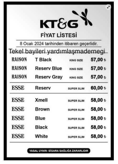 Farklı sigara gruplarına art arda gelen zamlar sonrası son sigara grubuna da zam geldi. Böylelikle zam gelmeyen sigara grubu kalmadı. Tekel Bayileri Yardımlaşma Derneği Başkanı Erol Dündar, KT&G sigara grubuna gelen zammı sosyal medya hesabından paylaştı. Yeni zamlı listeyle KT&G sigara grubundaki en ucuz sigara 57 TL oldu. En pahalısı sigara ise 60 TL'ye çıktı.