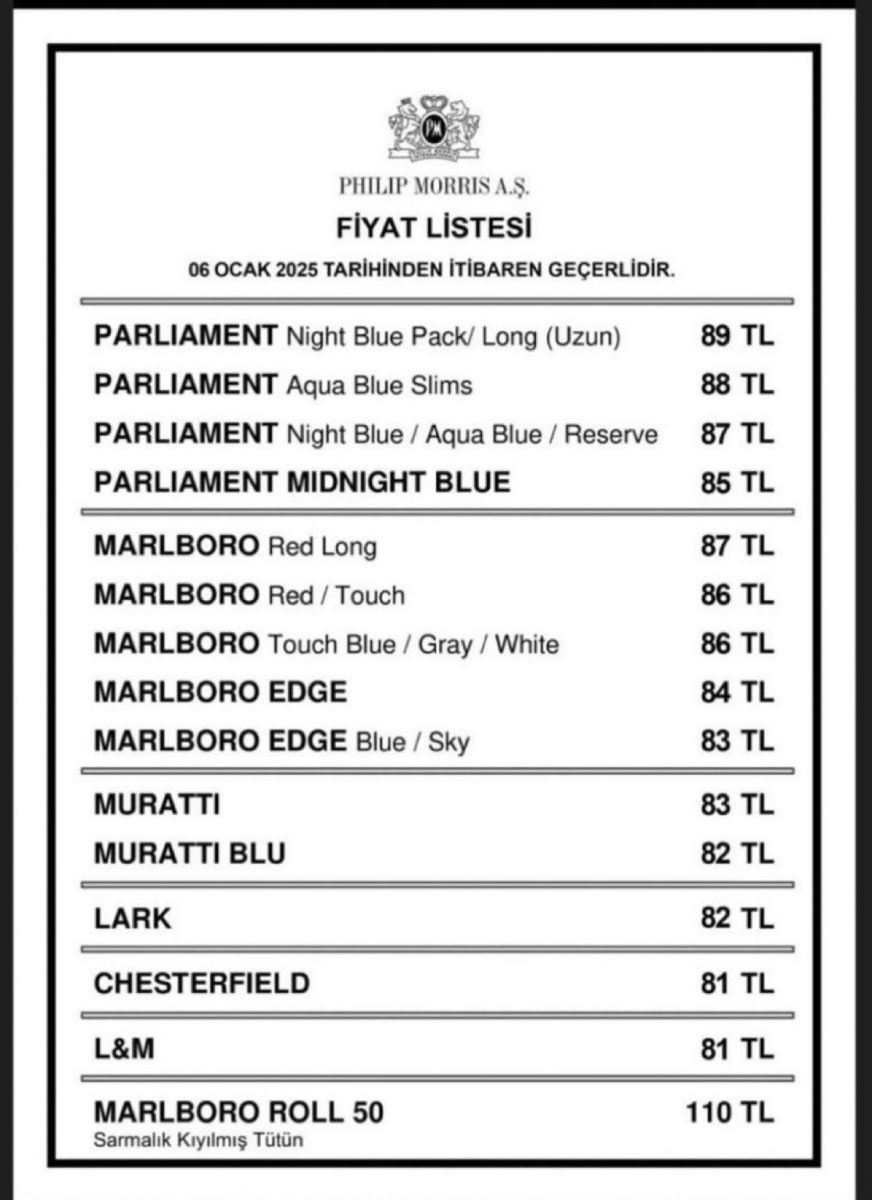 Sigara ve alkollü içkiye ÖTV zammı geleceği duyurulmuştu. Sigara sigara grubuna zam geldi ve en ucuz sigara 6 Ocak 2025 itibariyle 81 lira oldu.
