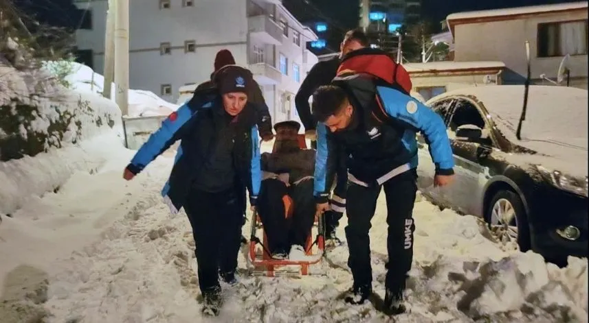 Zonguldak'ta yoğun kar yağışı ve buzlanma nedeniyle evlerinde rahatsızlanan 81 ve 90 yaşındaki iki hasta, Ulusal Medikal Kurtarma Ekipleri'nin (UMKE) yardımıyla hastaneye kaldırıldı.