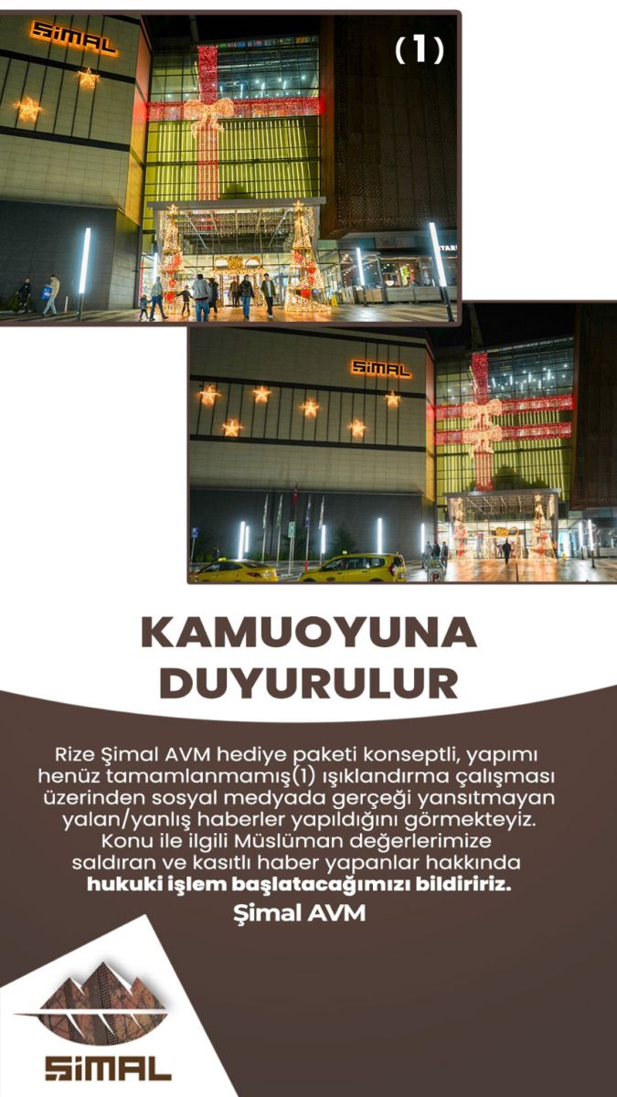 Tepkiler üzerine alışveriş merkezinin sosyal medya hesabından açıklama yapıldı. Açıklamada, “Rize Şimal AVM hediye paketi konseptli, yapımı henüz tamamlanmamış ışıklandırma çalışması üzerinden sosyal medyada gerçeği yansıtmayan yalan/yanlış haberler yapıldığını görmekteyiz. Konu ile ilgili Müslüman değerlerimize saldıran ve kasıtlı haber yapanlar hakkında hukuki işlem başlatacağımızı bildiririz” ifadeleri kullandı.