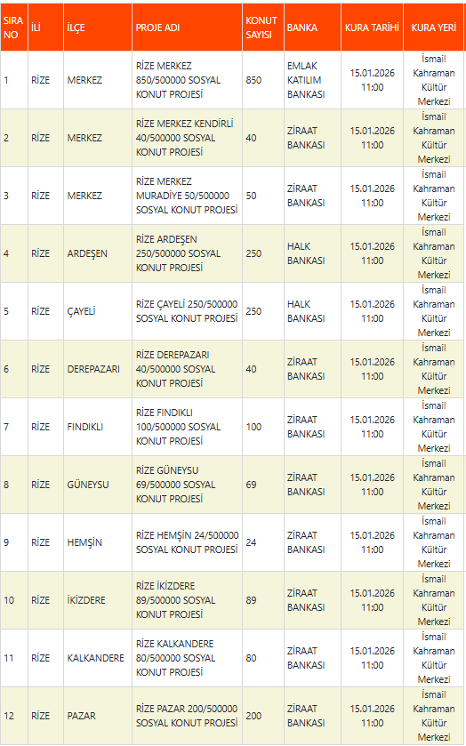 TOKİ’nin 500 bin sosyal konut projesi kapsamında il il açıkladığı kura takvimi doğrultusunda Rize’de hak sahiplerini belirleyecek kura çekimi, 15 Ocak 2026 Perşembe günü saat 11.00’de Rize İsmail Kahraman Kültür Merkezi’nde gerçekleştirilecek.