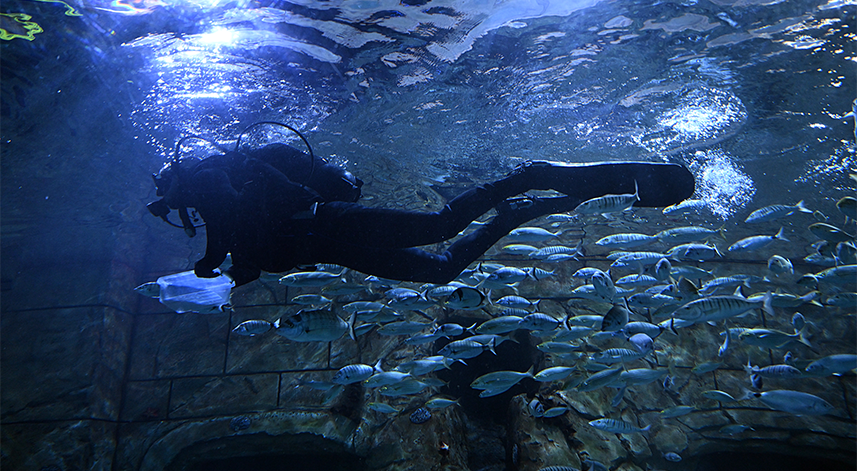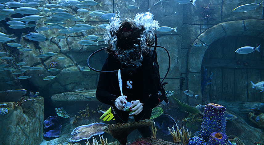 Üç dalgıç, köpek balığı ve vatozun da aralarında bulunduğu 83 türde binlerce balığa yuva olan akvaryumun temizliğini her gün programlanan şekilde yapıyor.