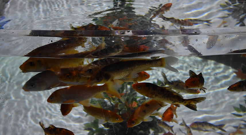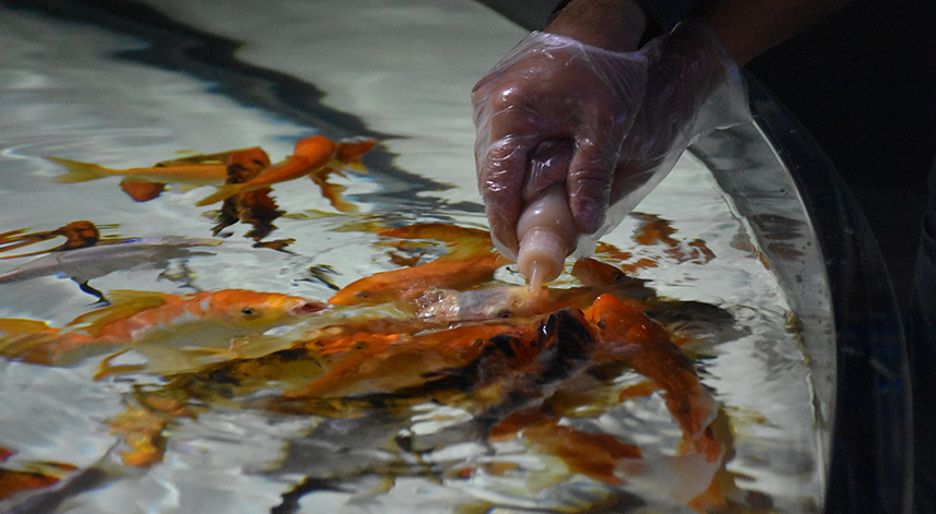 Koi balıklarının biberonla beslendiği akvaryumda, dalgıçların temizlik ve yemleme çalışmaları da ilgiyle izleniyor.