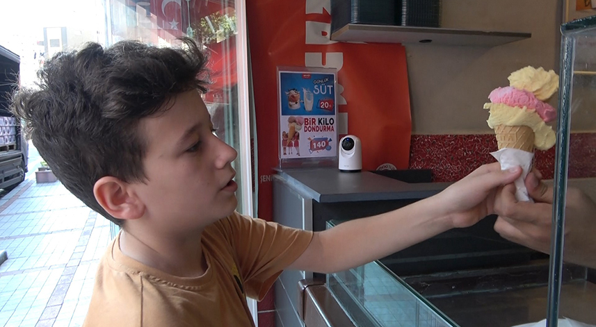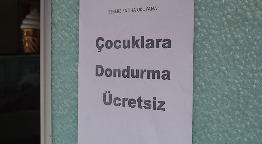 Yoldan geçerken yazıyı fark ettiklerini ve Fatiha okuyarak dondurmalarını aldıklarını ifade eden Eymen Şişman ise “Yoldan geçiyorduk ve yazıyı gördük. Fatiha okuyana bedava dondurma varmış. Biz de ağabeyin babası vefat ettiği için bizde gelip okuduk. Ondan sonrada ağabey dondurma verdi. Dondurma için mutlu olduk ama ağabeyin babası öldüğü için üzüldük” şeklinde konuştu.
