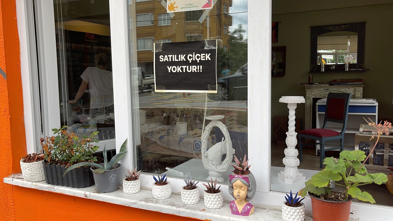 Rize'de bir sanat atölyesinde eğitmenlik yapan 48 yaşındaki Şaduman Öz, atölyenin penceresinde gözü gibi baktığı çiçekleri yoldan geçen herkesin istemesi üzerine cama "Satılık çiçek yoktur" yazısı astı.