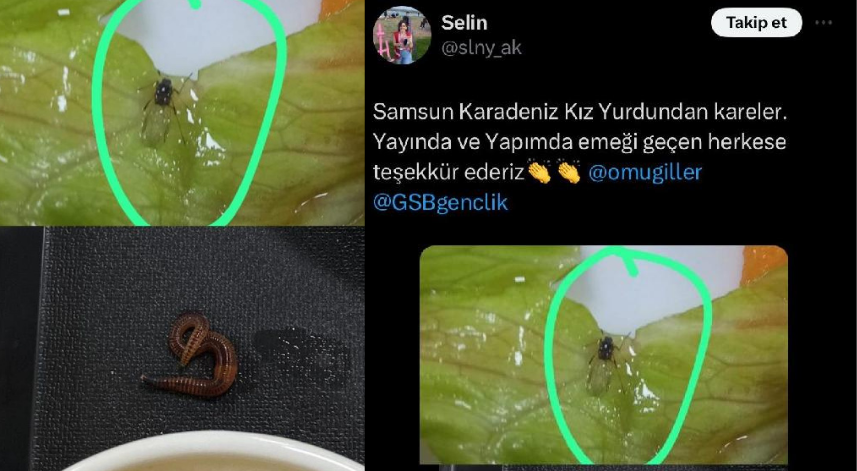Samsun’da Kredi Yurtlar Kurumu’na bağlı 2 bin 420 öğrencinin kaldığı ve bu yıl açılan Karadeniz Kız Yurdu’nda iddiaya göre bir öğrencinin yemeğinden böcek ve demir somun çıktı. Öğrenci sosyal medyada, “Samsun Karadeniz Kız Yurdu'ndan kareler. Yayında ve yapımda emeği geçen herkese teşekkür ederiz” notuyla fotoğraf paylaştı. Samsun Valiliği, tarafından konuyla ilgili soruşturma başlatıldı. Paylaşımın doğru olup olmadığı da araştırılıyor.