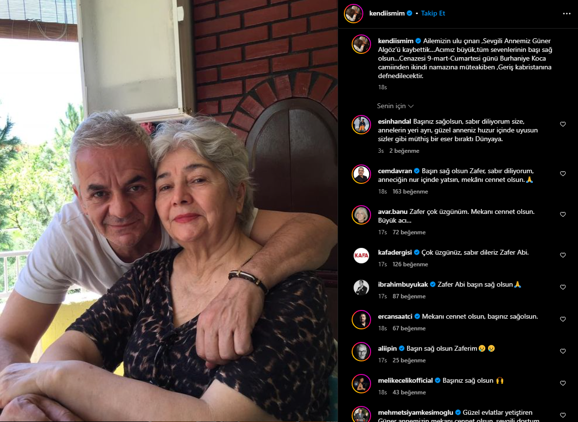 "Ailemizin ulu çınarı, sevgili Annemiz Güner Algöz’ü kaybettik. Acımız büyük, tüm sevenlerinin başı sağ olsun. Cenazesi 9 Mart Cumartesi günü Burhaniye Koca Camii'nden ikindi namazına müteakiben, Geriş Kabristanı'na defnedilecektir."