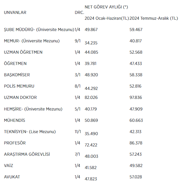 Bu artışlar neticesinde 2024 yılı temmuz dönemi itibarıyla bazı kamu görevlilerinin net görev aylığı şöyle belirlendi: