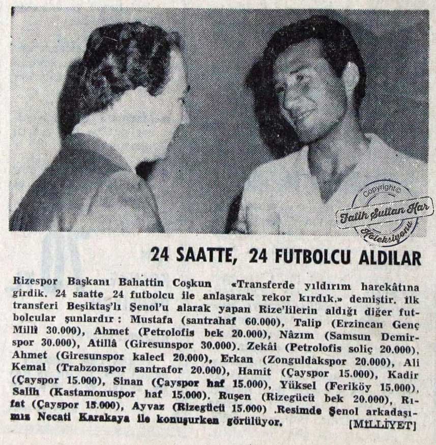 Rizespor Başkanı Bahattin Coşkun : “Transferde yıldırım harekâtına girdik. 24 saatte 24 futbolcu ile anlaşarak rekor kırdık.” demiştir. İlk transferi Beşiktaş’lı Şenol’u alarak yapan Rizelilerin aldığı diğer futbolcular şunlardır: Mustafa (santrahaf 60.000), Talip (Erzincan Genç Milli 30.000), Ahmet (Petrolofia bek 20.000), Nâzım (Samsun Demirspor 30.000), Atillâ (Giresunspor 30.000). Zekâi (Petrol of is soliç 20.000), Ahmet (Giresunspor kaleci 20.000), Erkan (Zonguldakspor 20.000), Ali Kemal (Trabzonspor santrafor 20.000), Hamit (Çayspor 15.000), Kadir (Çayspor 15.000), Sinan (Çayspov haf 15.000), Yüksel (Feriköy 15.000), Salih (Kastamonuspor haf 15.000). Ruşen (Rizegücü bek 20.000), Rıfat (Çayspor 15.000), Ayvaz (Rizegücti 15.000) . Resimde Şenol arkadaşımla Necati Karakaya ila konuşurken görülüyor.