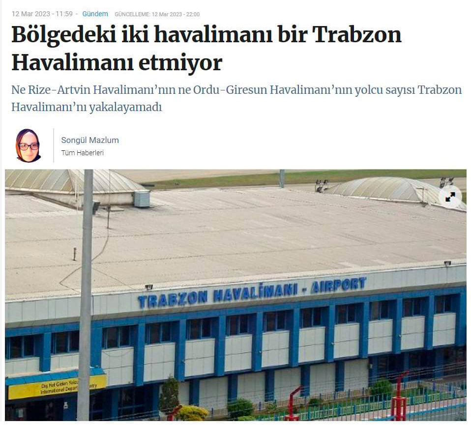 Karadeniz’de bölgesel yayın yapan merkezi Trabzon’da bulunan Günebakış Gazetesi’nde Songül Mazlum’un kaleme aldığı yazıdan “Bölgedeki iki havalimanı bir Trabzon Havalimanı etmiyor” başlığı atmış.